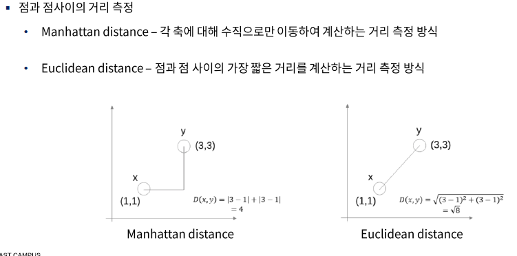 -> 데이터의 차원이 커질 수록 잘 맞지않음 . 2차원 3차원 까지는 알 수 있지만 4차원 부터는 거리에 대한 개념이