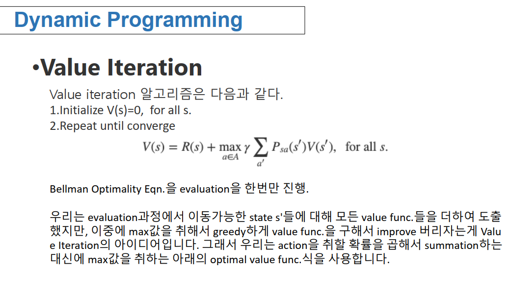 value iteration은 앞의 두가지 과정을 한꺼번에 하는 것