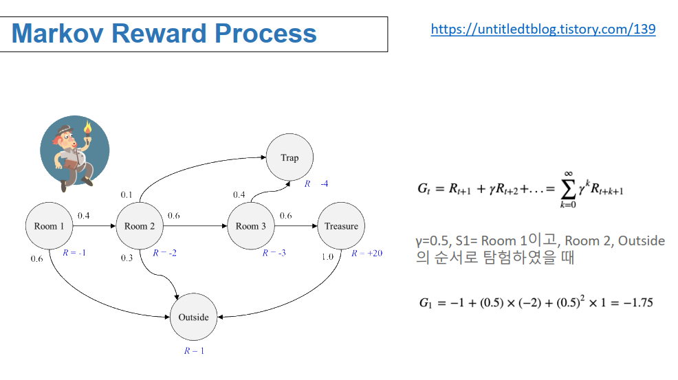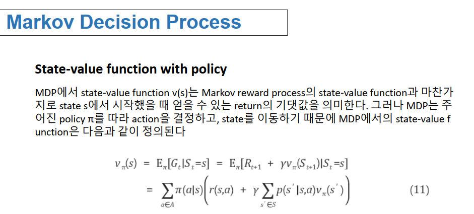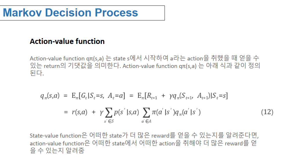ex) Reward 4개가 있다면 4가지 행동들에 대해서 일어날수 있는 확률들과 보상값들의 평균적인 보상이 value function