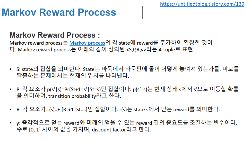 s -> s` (위의 그림은 이전스테이트에서 다음스테이트의 관계식을 설명하는 식, state transition matrix)