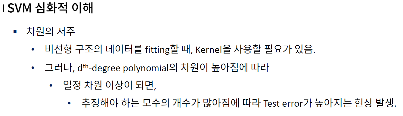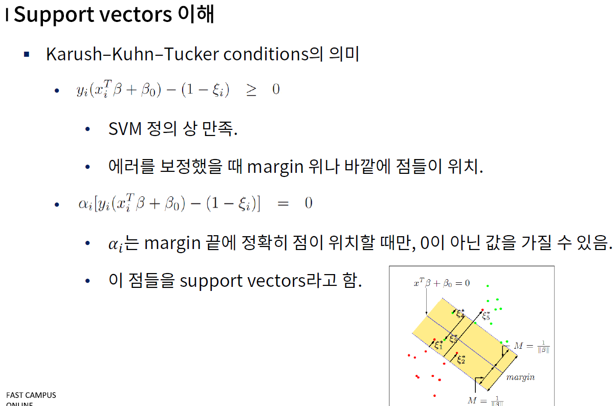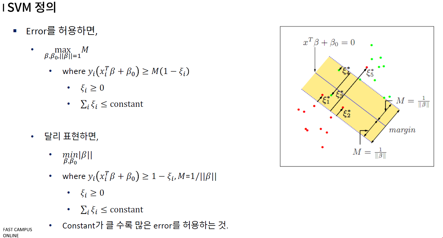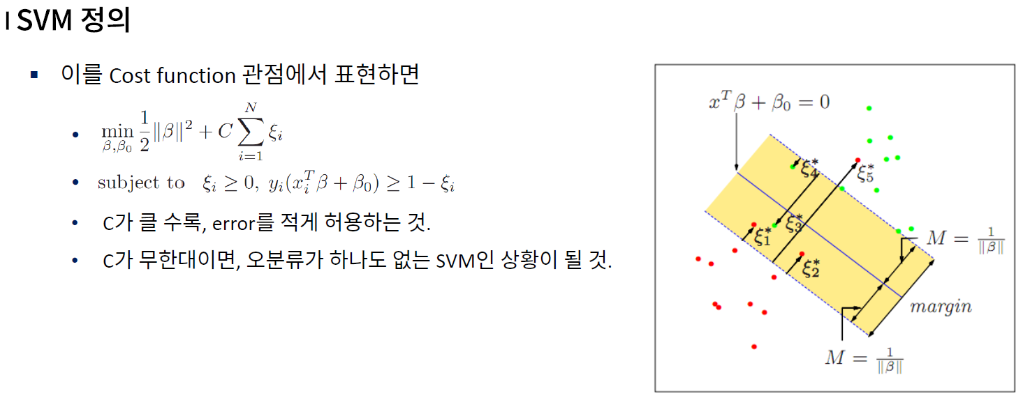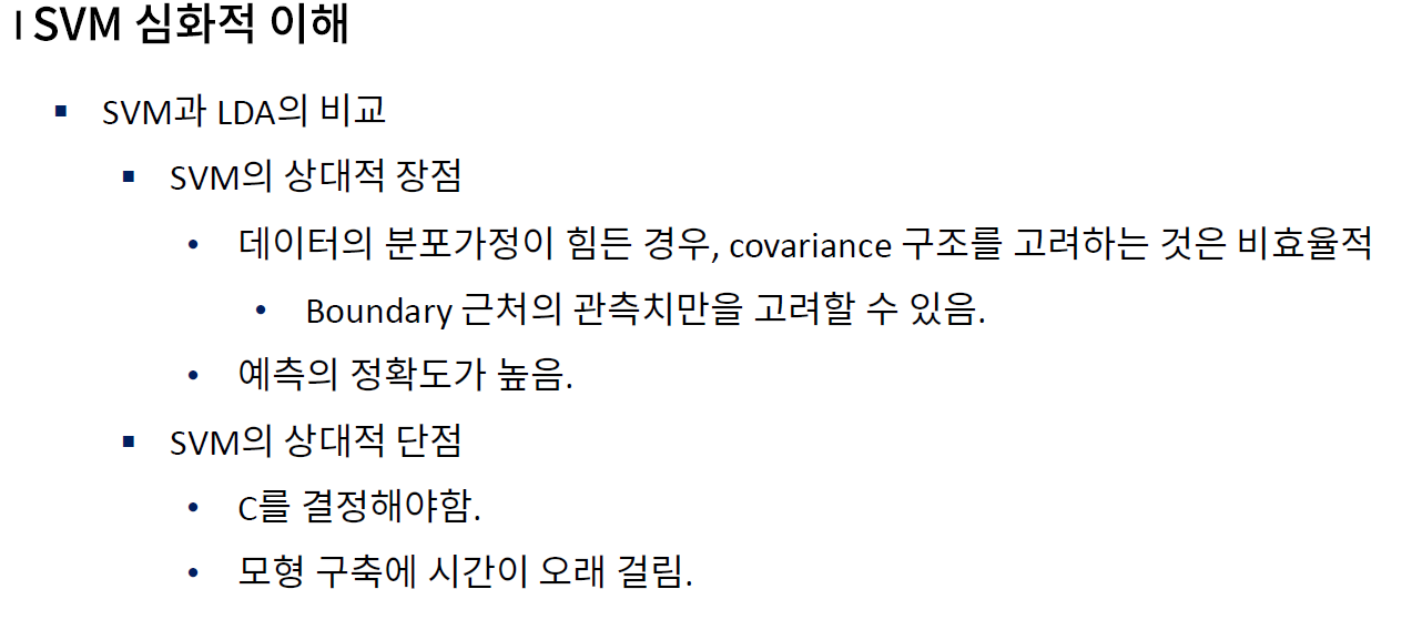 상대적으로 LDA 에 비해 단점은 C를 결정해야함(에러들의 합 앞에 붙은상수) C가커지면 에러가 최대한 안범하게 C가 무한대가 되면 에러가 하나도 없어야한다 C가작으면 에러가 좀있어도 된다라는 LOSS FUNCTION- COST FUNCTION안에 있던 상수